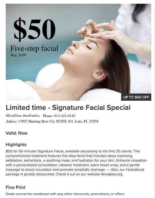 At Med Spa 4EvaGlow in Tampa, indulge in exclusive membership promotions and enjoy advanced skincare, rejuvenating therapies, and luxury treatments that keep you glowing year-round. Memberships require a 6-month commitment with a 30-day written cancellation notice. Discounts and promotions cannot be combined and do not apply to add-on services. Skincare product discounts may be shared with members, friends, and family.