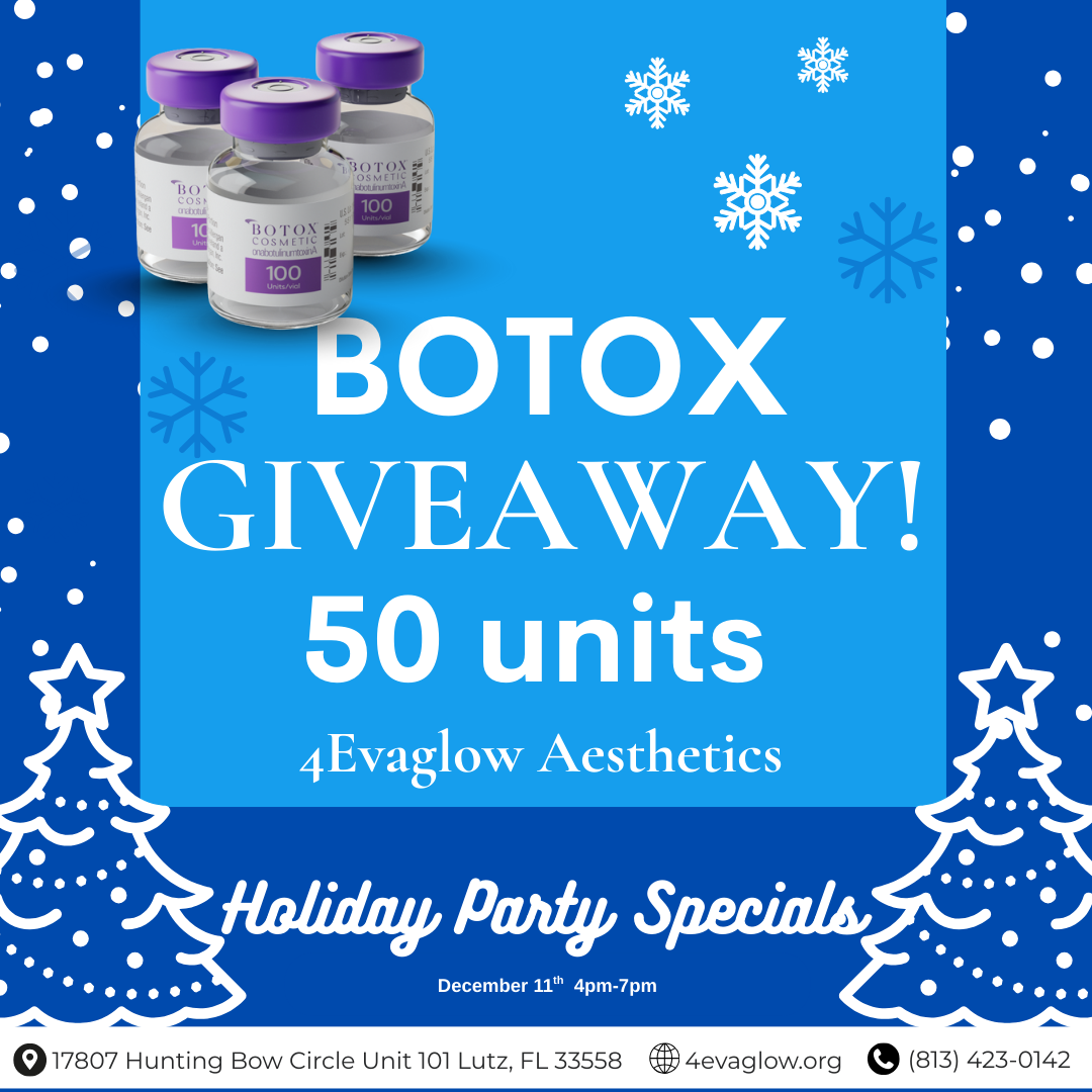 Holiday Botox Specials Lutz: 50-Unit Giveaway & 4EvaGlow Holiday Party Kick off the season with holiday Botox specials in Lutz! The holidays are all about celebrating, giving back, and ending